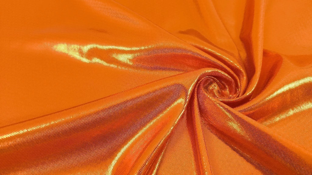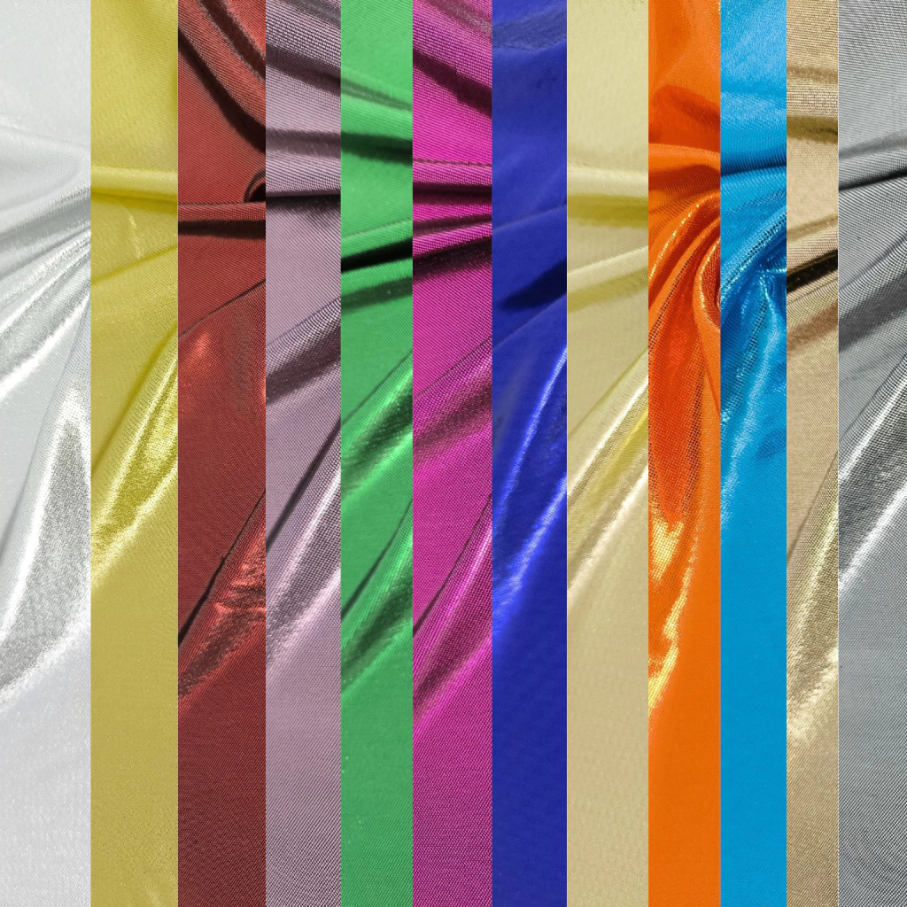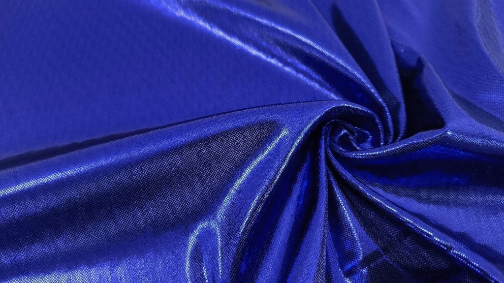 Lamê é um tecido com acabamento metalizado e lâminas finas de metal, que lhe confere um brilho intenso. É um tecido maleável, com caimento fluido e leve transparência.